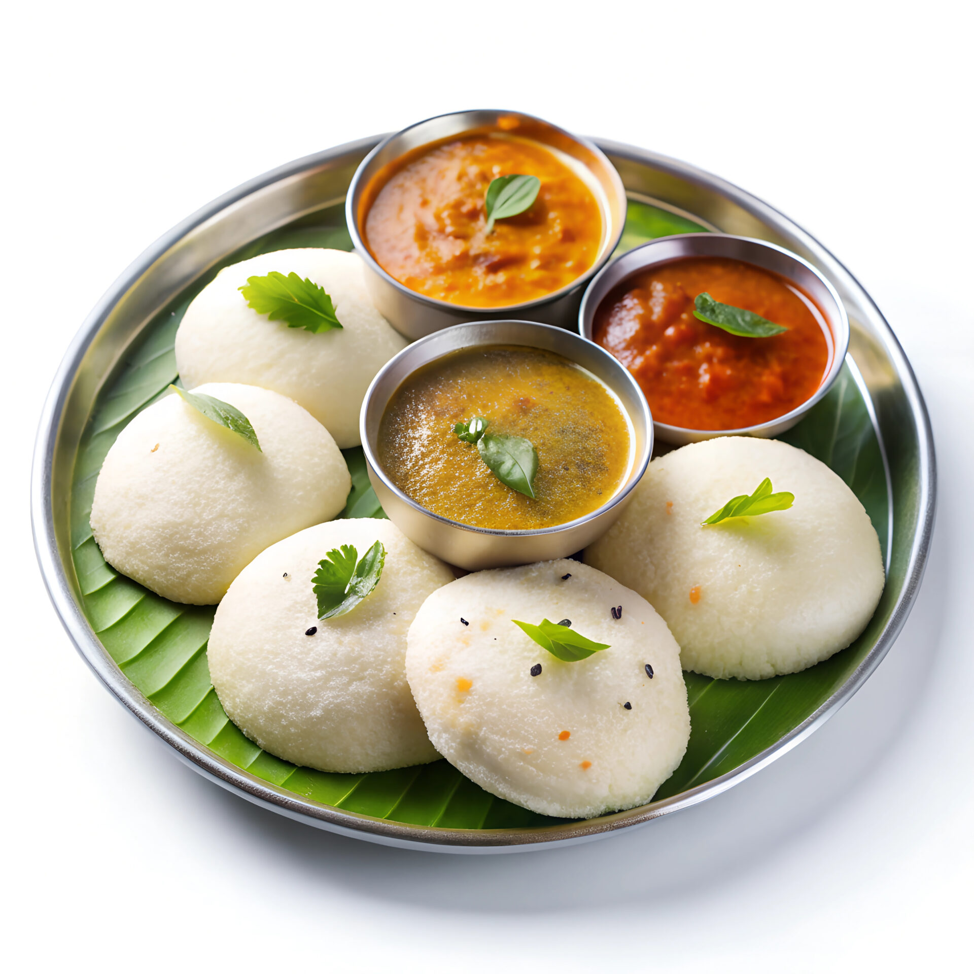 Soft steamed rice cakes served with aromatic sambar and chutney.